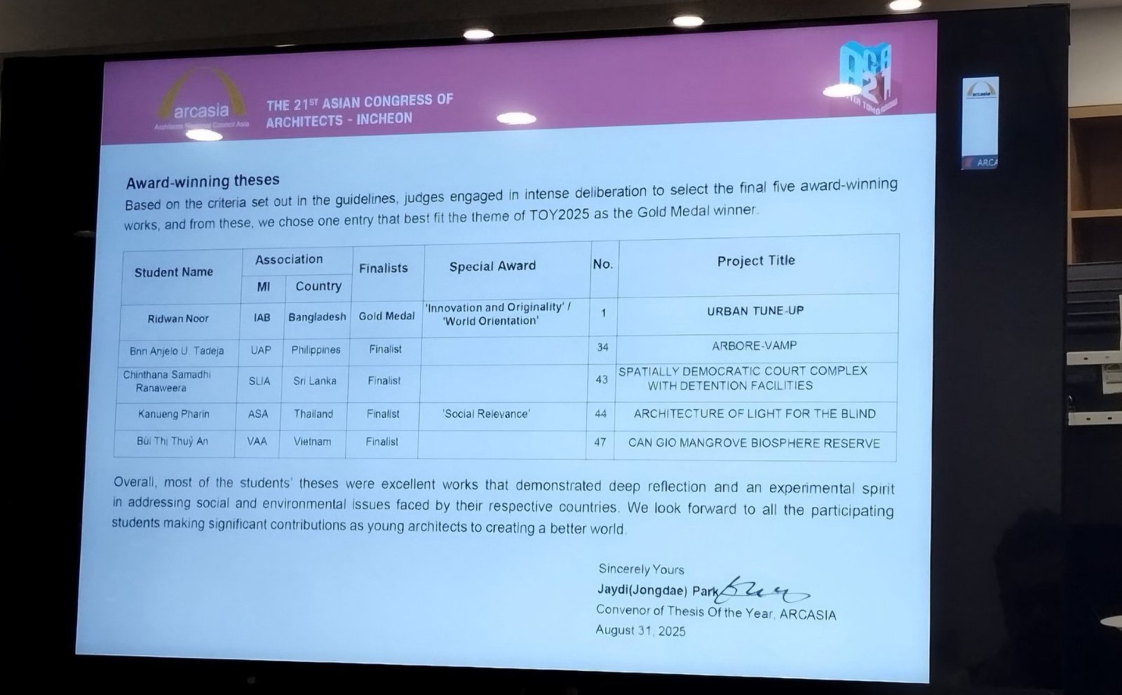 Participation in the 21st Asian Congress of Architects" held in Incheon, South Korea.